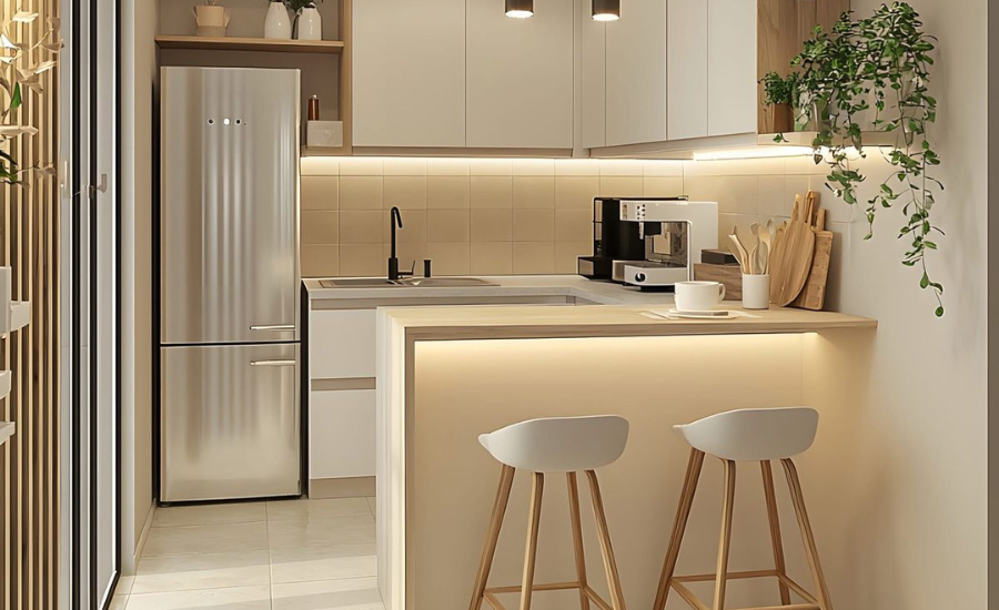 Sử dụng nội thất nhỏ gọn và thông minh giúp gia chủ tối ưu hoá diện tích bếp. Đảm bảo được đầy đủ tiện ích mà bạn muốn. Những nội thất, dụng cụ nhà bếp được tích hợp vô số chức năng hiện đại mà lại nhỏ gọn. Giúp gia chủ sắp xếp gọn gàng. Nội thất nhà bếp giúp việc thiết kế mẫu nhà bếp nhỏ đẹp đơn giản bao gồm: Tủ bếp có cửa sổ, lò nướng 3 trong 1, tủ lạnh đa chức năng, kệ chén nhiều tầng,….