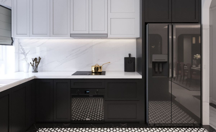 Là một trong những phong cách mang tính biểu tượng nhất. Phù hợp với mọi không gian, đặc biệt khi đi kèm với sàn kẻ caro. Để cho nhà bếp không bị quá tối, bạn nên để màu đen chiếm khoảng 10% đến 20%. Đôi khi, ta không nhất thiết phải sử dụng màu đen, hãy thay đổi chút ít bằng cách sử dụng màu đen charcoal hoặc một số màu xám nhạt.