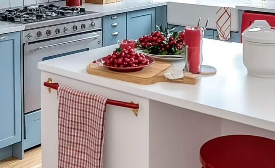 Bộ ba màu sắc này tạo ra những màu sắc lý tưởng nhất cho nhà bếp. Màu trắng đem lại cảm giác sạch sẽ, hiện đại; màu xanh đem lại vẻ đẹp mềm mại, sức sống; và màu đỏ chính là thứ tạo cảm giác thèm ăn mà bất kỳ không gian bếp nào cũng cần. Nếu bạn chưa biết làm thế nào để kết hợp bộ ba màu này thì thử theo cách sau nhé. Sử dụng màu xanh navy ở một số chỗ như mặt đảo bếp hoặc chỗ ngồi, màu đỏ cho các điểm nhấn nhỏ, như rèm cửa, sách và khăn tắm.